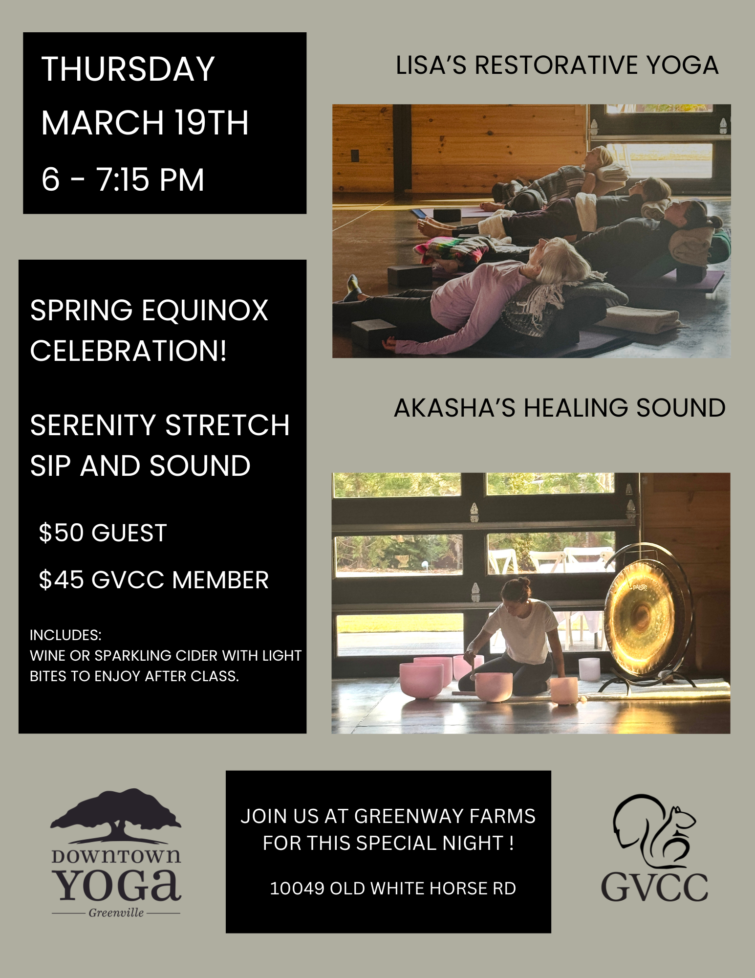 SPECIAL EVENT FOR YOU 6 - 7:15 pm / DYG at Greenway Farms. Spring Equinox: Serenity Stretch, Sip and Sound with Lisa and Akasha 50.00 register
